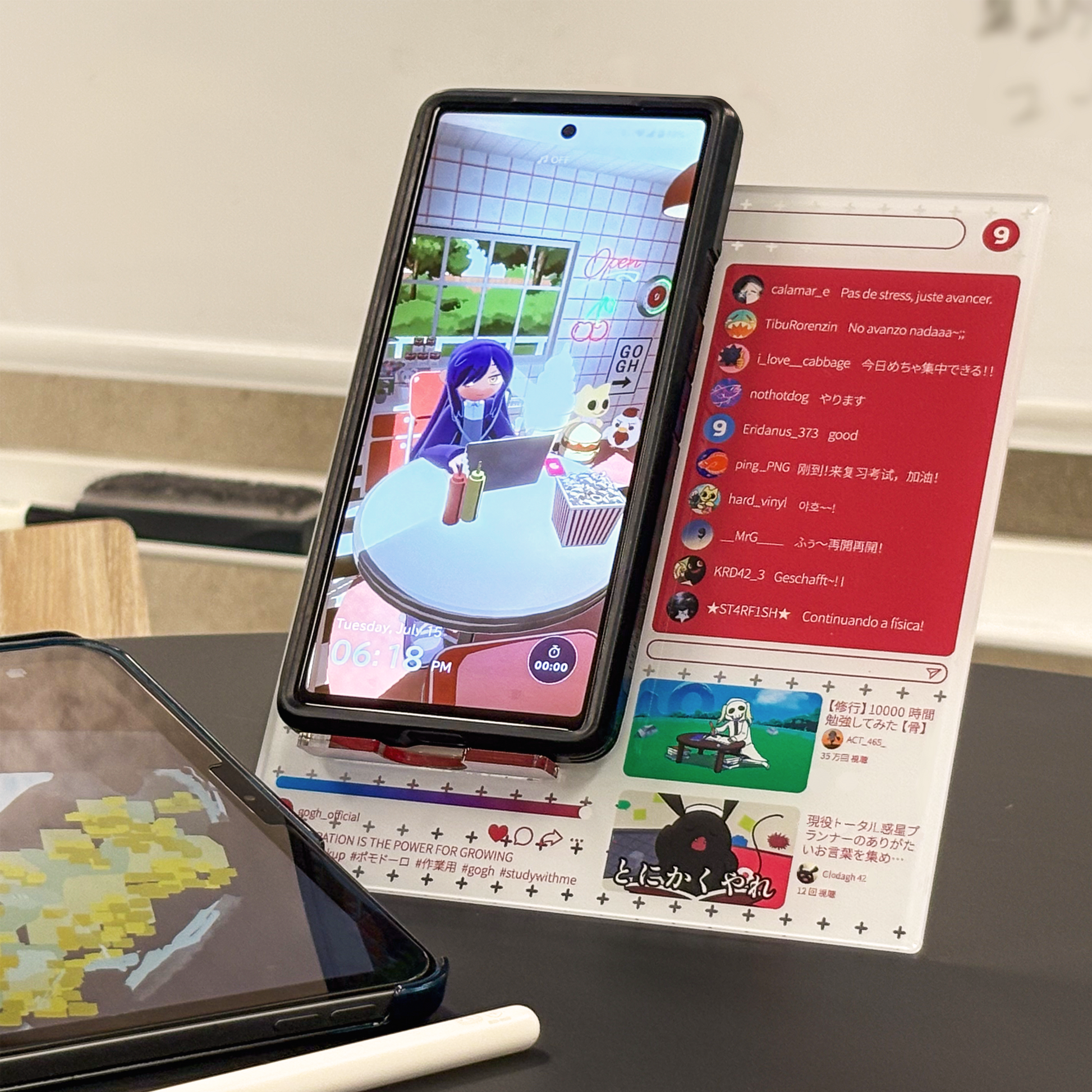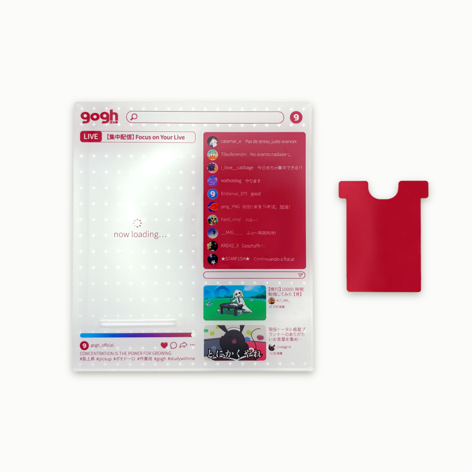 配信者のコメント欄やライブの“いいね”が流れるような配信画面風レイアウトをアクリル板の背面にプリント。置くだけでスマホの世界とデスクワークの世界を切り分け、「見たい情報だけ視界に入り、手では触れない」——集中力を削らない“半没入”環境を実現します。